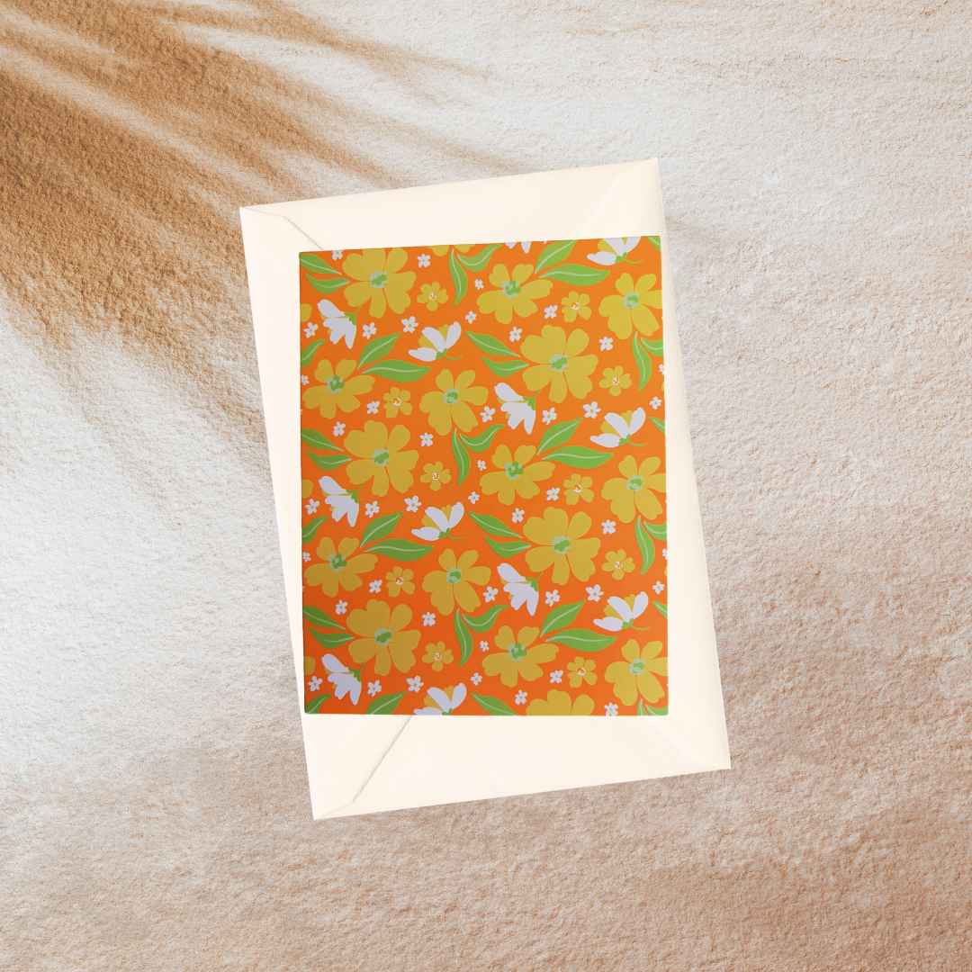 Een oranje kaart met gele en witte bloemen.