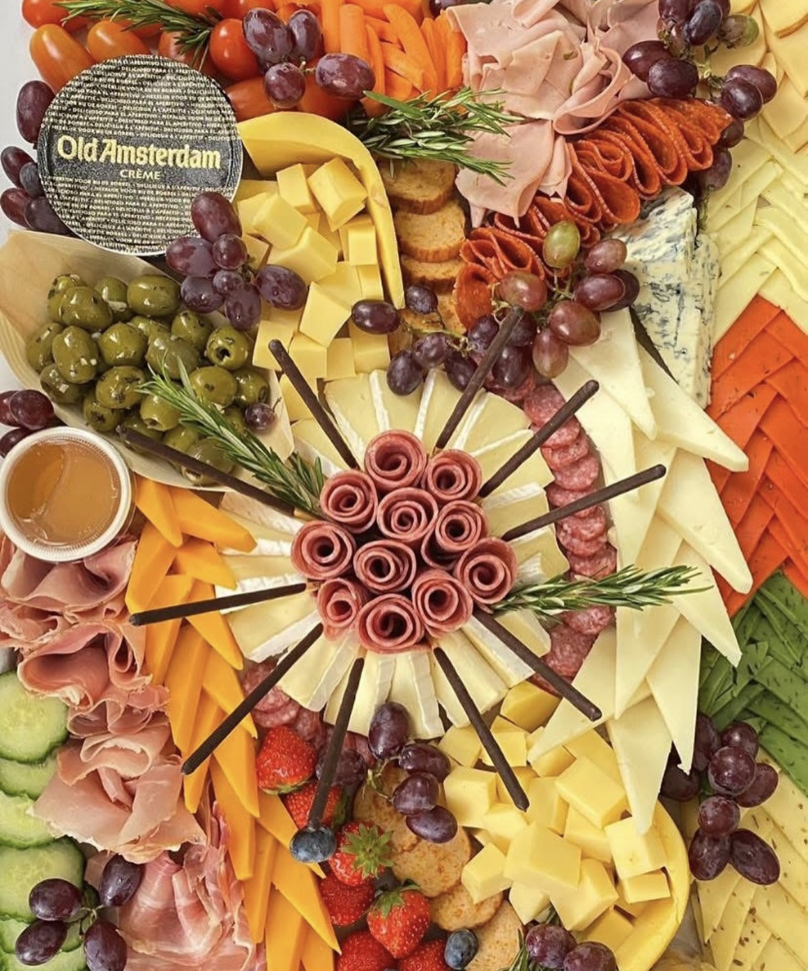 Een royaal belegde borrelplank met diverse kazen, fijne vleeswaren, olijven, nootjes, dips, verse groenten, fruit en chocolade — met onder andere Gouda, brie, pesto- en blauwe kaas, prosciutto, salami en peperoni. Een feest voor elke borrel.