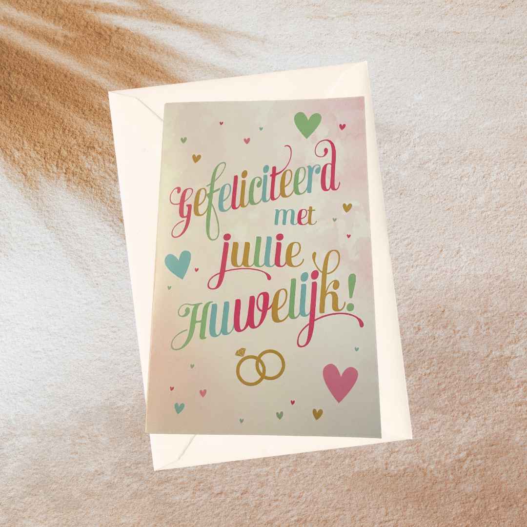 Een licht roze kaart met de tekst: Gefeliciteerd met jullie huwelijk!